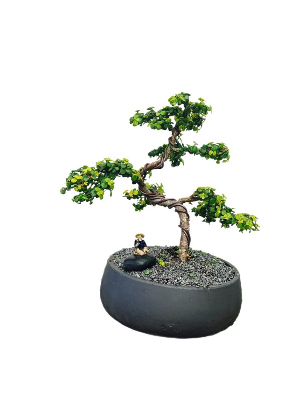 צמח זה מעוצב ע”י אומן בונסאי בעבודת יד ומגיע עם כלי קערה ,הצמח והכלי מגיעים בדיוק כמו בתמונה כולל פסלון דייג.