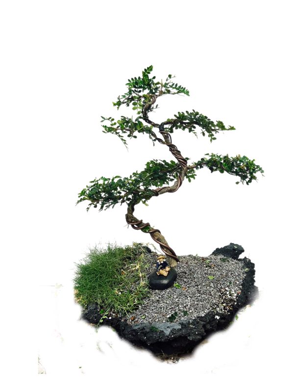 צמח זה מעוצב ע”י אומן בונסאי בעבודת יד ומגיע עם כלי מחרס ,הצמח והכלי מגיעים בדיוק כמו בתמונה כולל פסלון דייג.